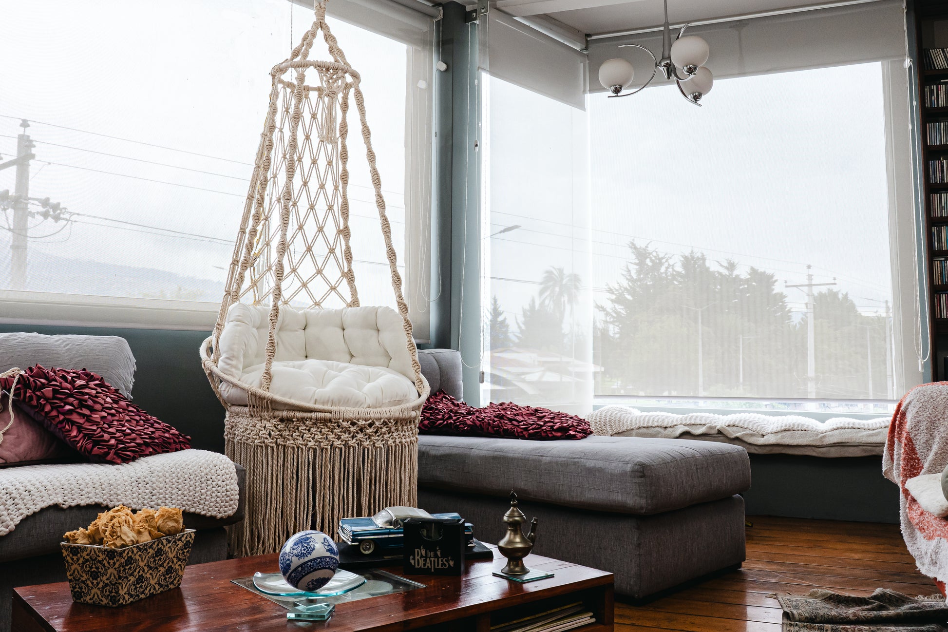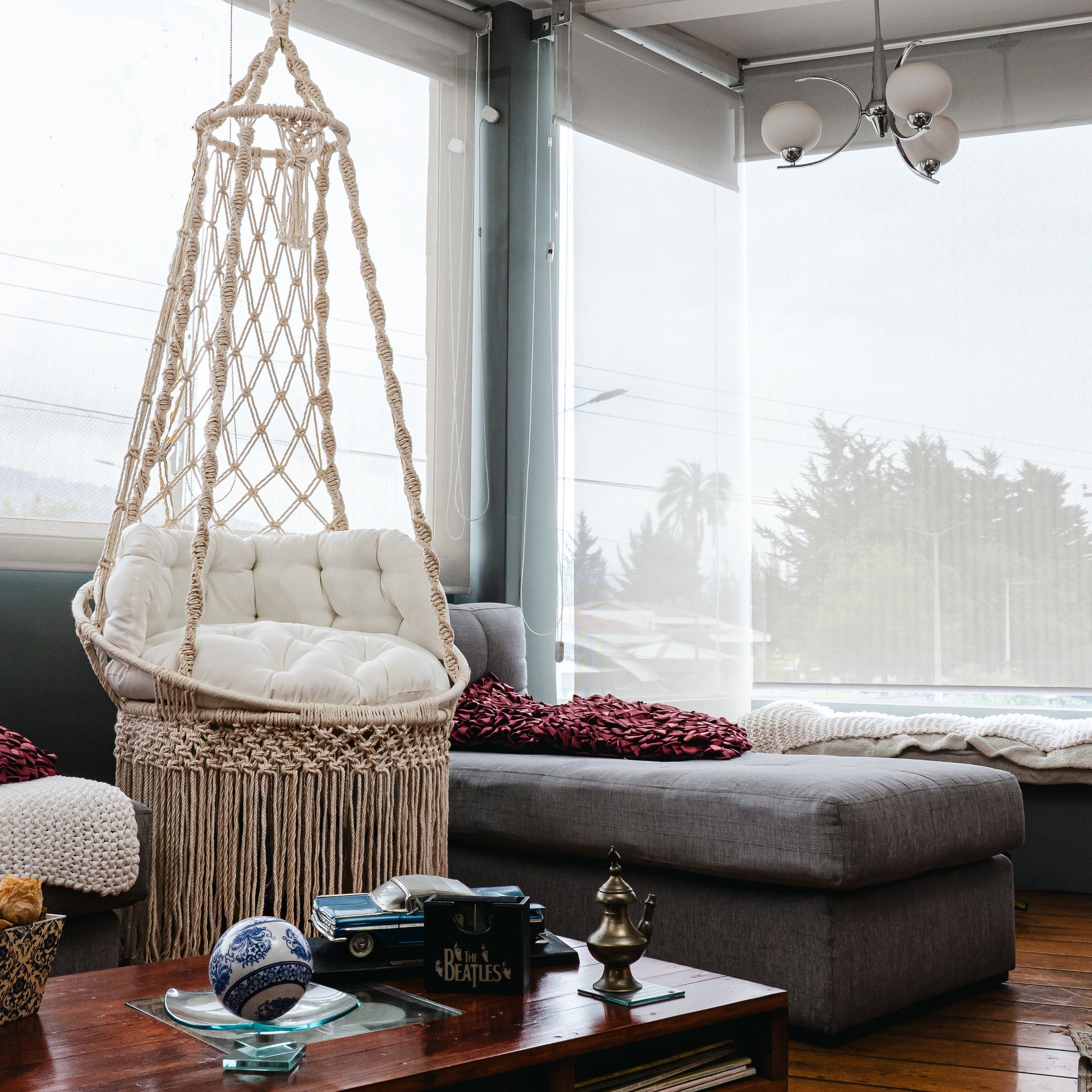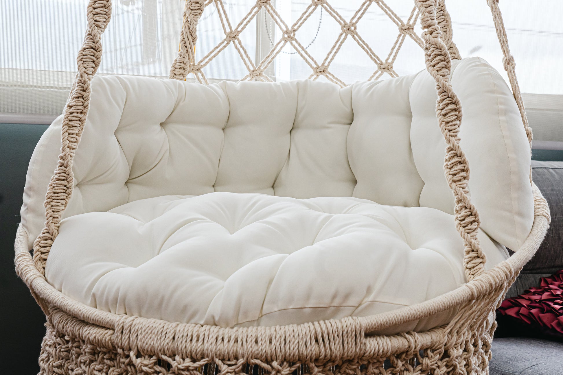 Silla colgante con 3 aros metálicos internos, tejido a mano con piola trenzada. Resiste hasta 200 kg.