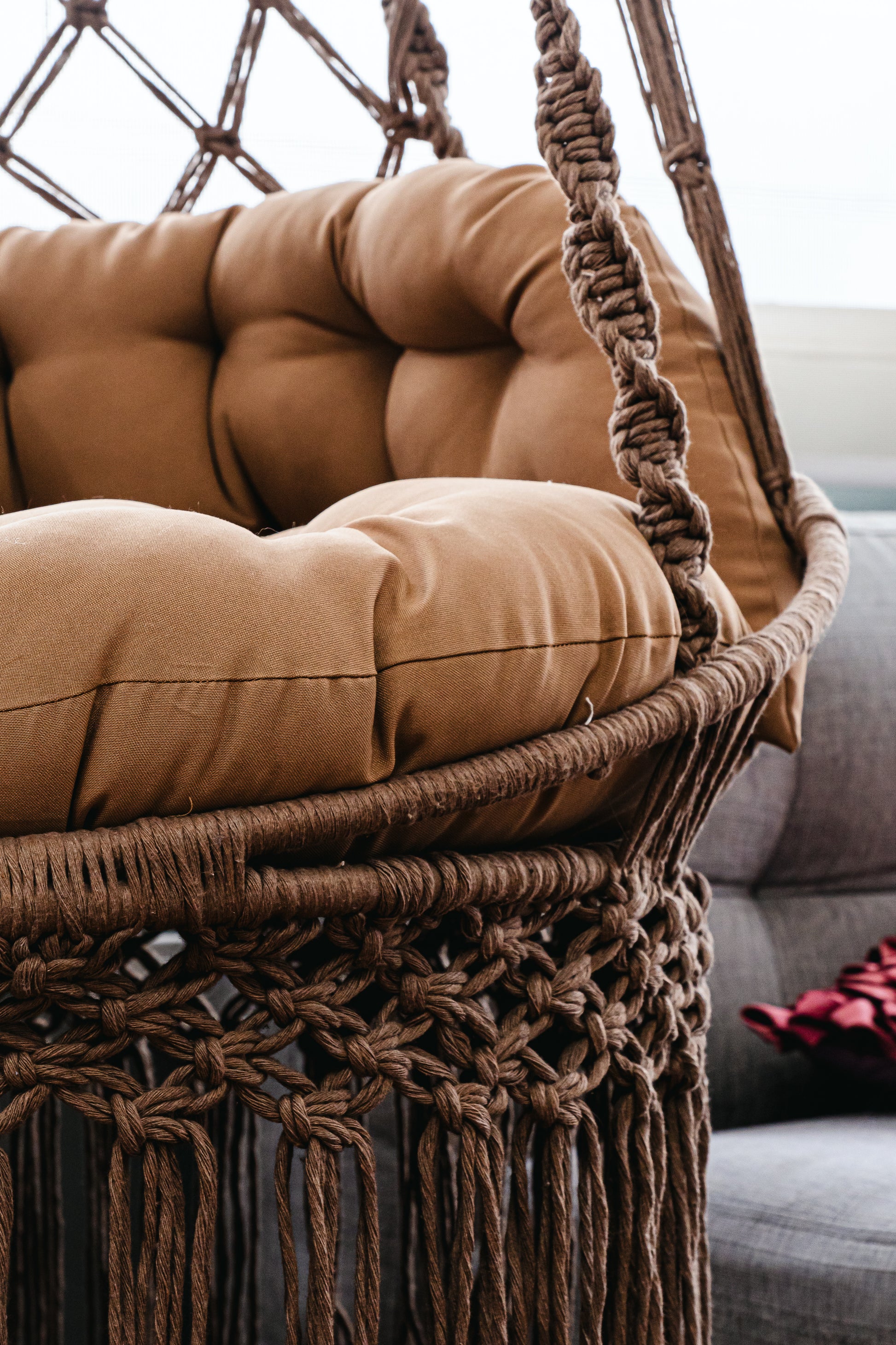 Silla colgante con 3 aros metálicos internos, tejido a mano con piola trenzada. Resiste hasta 200 kg.